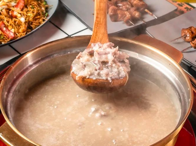 強(qiáng)叔現(xiàn)切豬雜粥以粥底之上的鮮味為主,用豬雜和精米一起,并配以高溫及其他十多種材料熬制而成。主要和粥品搭配的有:水魚、生魚配黃鱔或塘虱;羔蟹、肉蟹配基圍蝦或鮑魚仔;家雞等等,品種繁多,味道精美。