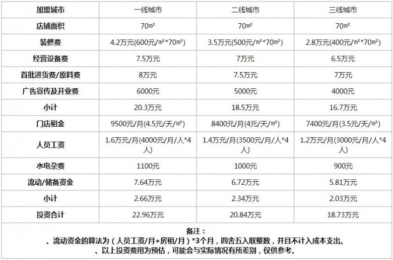 佰燒海鮮烤肉自助加盟費(fèi)多少?這個(gè)品牌的投資在各個(gè)城市都會(huì)有所不同,在下面小編以一線城市、二線城市和三線城市來(lái)給大家列出了相關(guān)的費(fèi)用表格,其中投資都包含了裝修費(fèi)、經(jīng)營(yíng)設(shè)備費(fèi)、首批進(jìn)貨費(fèi)、宣傳費(fèi)、門店租金、人員工資、水電費(fèi)和流動(dòng)資金等,具體請(qǐng)如下表所示: