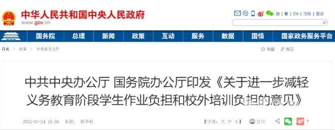 7月24日,中共中央辦公廳、國(guó)務(wù)院辦公廳《關(guān)于進(jìn)一步減輕義務(wù)教育階段學(xué)生作業(yè)負(fù)擔(dān)和校外培訓(xùn)負(fù)擔(dān)的意見》(以下簡(jiǎn)稱為“雙減”)。