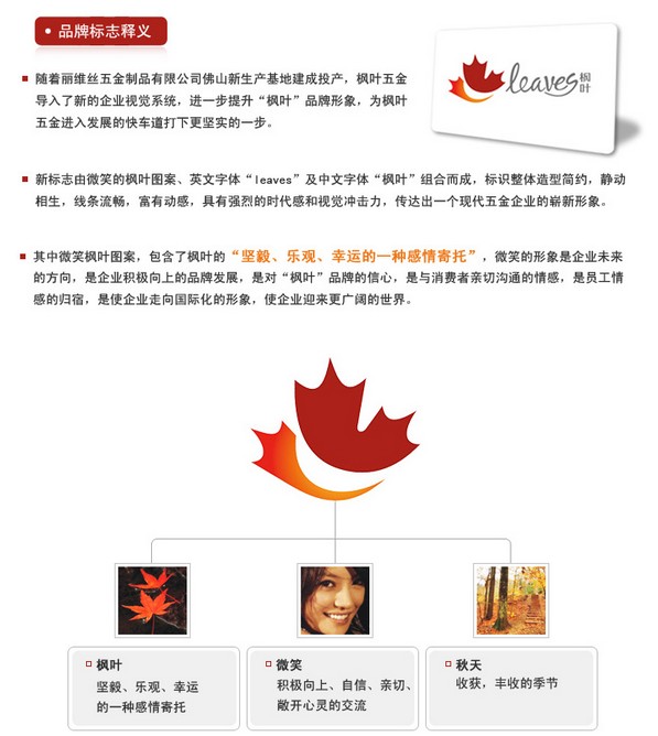 家居柜腳系列等五金產(chǎn)品的設(shè)計(jì)、研發(fā)、生產(chǎn)、銷售、服務(wù)。1995年開(kāi)始,,設(shè)計(jì)開(kāi)發(fā)出多款引領(lǐng)家用五金產(chǎn)品的專利產(chǎn)品。2003年公司注冊(cè)“楓葉”品牌以來(lái),憑借高水準(zhǔn)的設(shè)計(jì)和專業(yè)化的服務(wù),打造“楓葉”品牌形象,贏得了眾多國(guó)內(nèi)外客戶的信賴和支持。2009年7月,隨著麗維絲佛山新生產(chǎn)基地建成投產(chǎn),楓葉五金導(dǎo)入了新的企業(yè)視覺(jué)系統(tǒng),經(jīng)一步提升“楓葉”品牌形象,為楓葉五金進(jìn)入發(fā)展的快車道大俠更堅(jiān)實(shí)的一部。