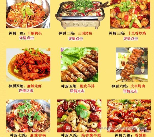 自1996年創(chuàng)建以來,以十里香炒雞技術(shù)迅速崛起,公司開設(shè)了多家直營店,并且家家生意火爆,并相繼推出重慶烤魚系列、火鍋系列、干鍋系列、燜鍋系列、霸王燒烤系列、鐵板燒系列、麻辣燙系列、麻辣小龍蝦、脆皮羊排等特色菜品以及多種特色小吃和骨湯面等技術(shù)。2002年,公司開發(fā)、推廣先烤后燉、湯鮮味美的特色絕技“三國烤魚”,深受全國業(yè)內(nèi)人士的青睞和追捧。