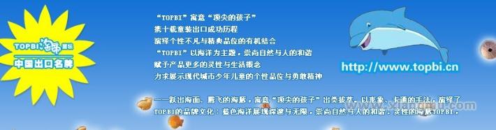 topbi寓意“頂尖的孩子”,以海洋為主題,崇尚自然與人的和諧,產(chǎn)品緊貼國際童裝發(fā)展潮流,結合個性品位的款式與優(yōu)良面料的運用,賦予產(chǎn)品更多的靈性與生活概念。旨在創(chuàng)造個性時尚,詮釋另類流行,力求展現(xiàn)少年兒童的個性與品位。
