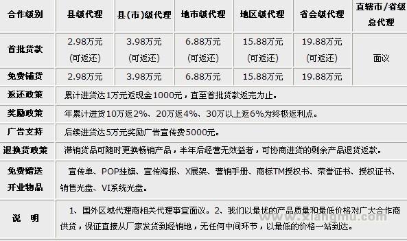 6、根據(jù)公司規(guī)定的城市區(qū)域獨(dú)家代理級(jí)別,交納相應(yīng)的代理費(fèi)用。
