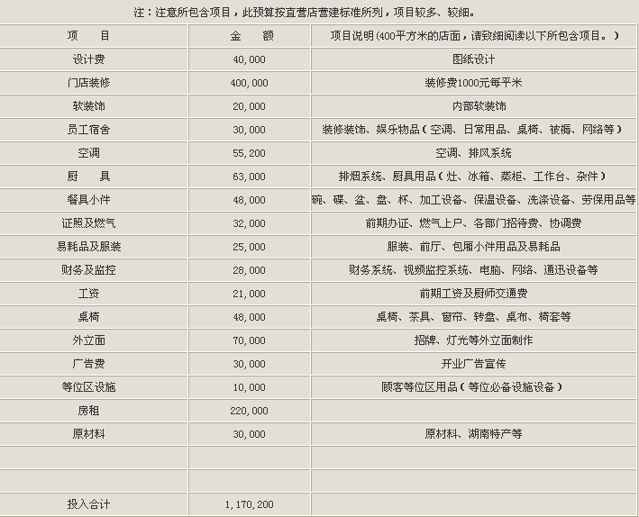 總投資費用預(yù)算表。