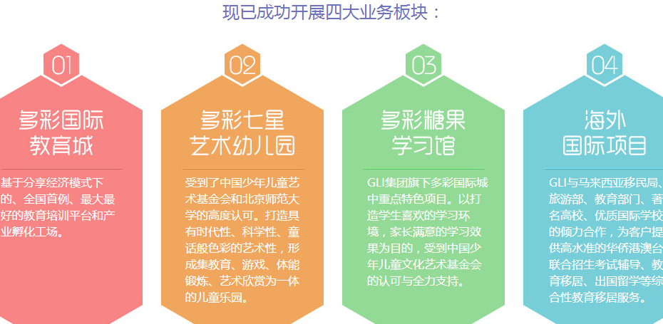 GLI國際教育集團(tuán)是一家在國際教育領(lǐng)域獲得公眾認(rèn)可的生力軍,集團(tuán)自2000年成立以來,始終致力于引進(jìn)國外教育理念和方法,發(fā)展完善國內(nèi)培訓(xùn)教育事業(yè)。集團(tuán)在發(fā)展的過程中,在教育局領(lǐng)導(dǎo)、合作院校領(lǐng)導(dǎo)班子和社會各界的支持與關(guān)懷下,現(xiàn)已成功開展四大業(yè)務(wù)板塊,“多彩國際教育城”“多彩七星藝術(shù)幼兒園”、“多彩糖果學(xué)習(xí)館”“海外國際項(xiàng)目”。