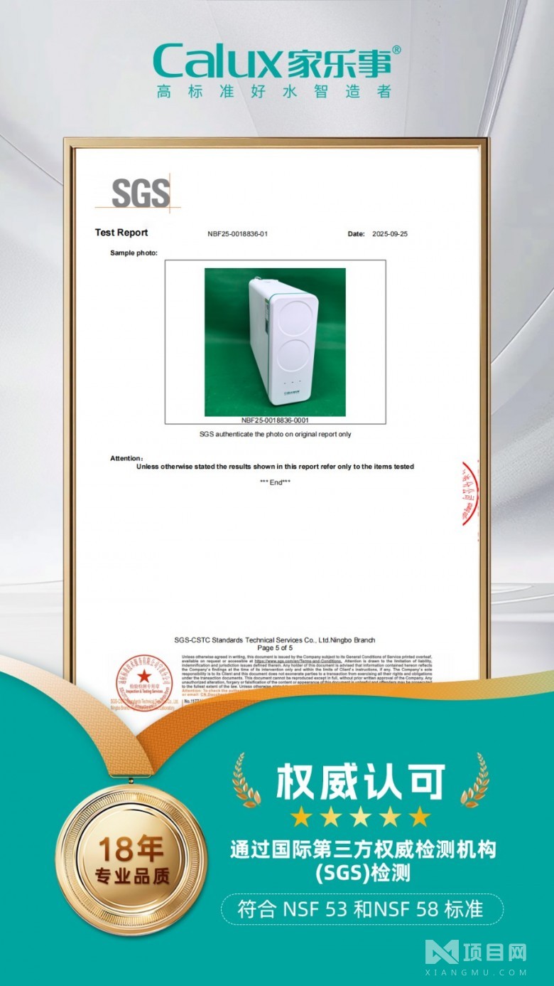 凈水效果的核心在于 “有據(jù)可依”,因此,家樂(lè)事J1012 主動(dòng)接受全球檢測(cè)巨頭 SGS 的全面檢測(cè),憑借卓越性能順利通過(guò)認(rèn)證,其報(bào)告所具備的 ISO17025 與 CMA 雙重認(rèn)可資質(zhì),相當(dāng)于為水質(zhì)安全貼上 “國(guó)際通行證”。